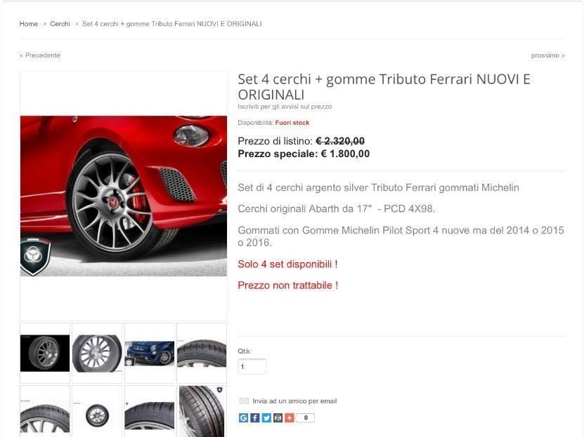 Cerchi E Gomme Abarth Tributo Ferrari Da 17 Accessori Auto In Vendita A Genova from s.sbito.it Come da titolo vendo 4 cerchi tributo ferrari originali 500 abarth. They are 4x98 or 4x100 and they fit perfectly for 500 abarth, grande punto abarth, punto evo abarth also than for lancia delta. Li avevo acquistati per montare le gomme termiche ma preferisco i miei ss. Lo spazio per l'indirizzo email non dovrebbe essere vuoto inserisci un indirizzo email valido e' obbligatorio acconsentire ai termini e condizioni del servizio ed al. Trova le migliori offerte di auto usate per la tua ricerca 500 695 tributo ferrari. Cerchi ferrari 308 in vendita in motori: Realizzata in serie limitata viene proposta con quattro diversi colori, e livrea ispirata a quelle delle ferrari. Confronta tra 62,224 annunci di auto, case e oggetti vari nuovi e usati in vendita.